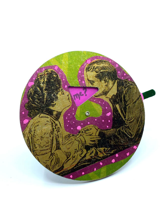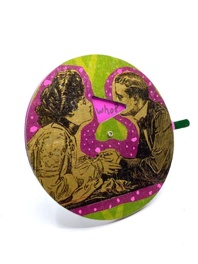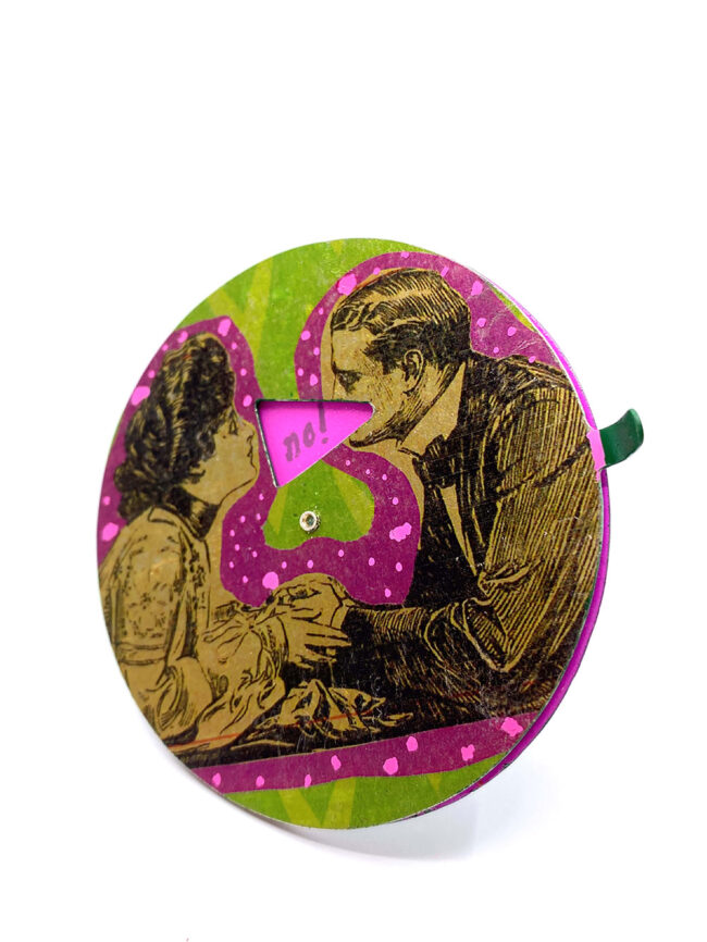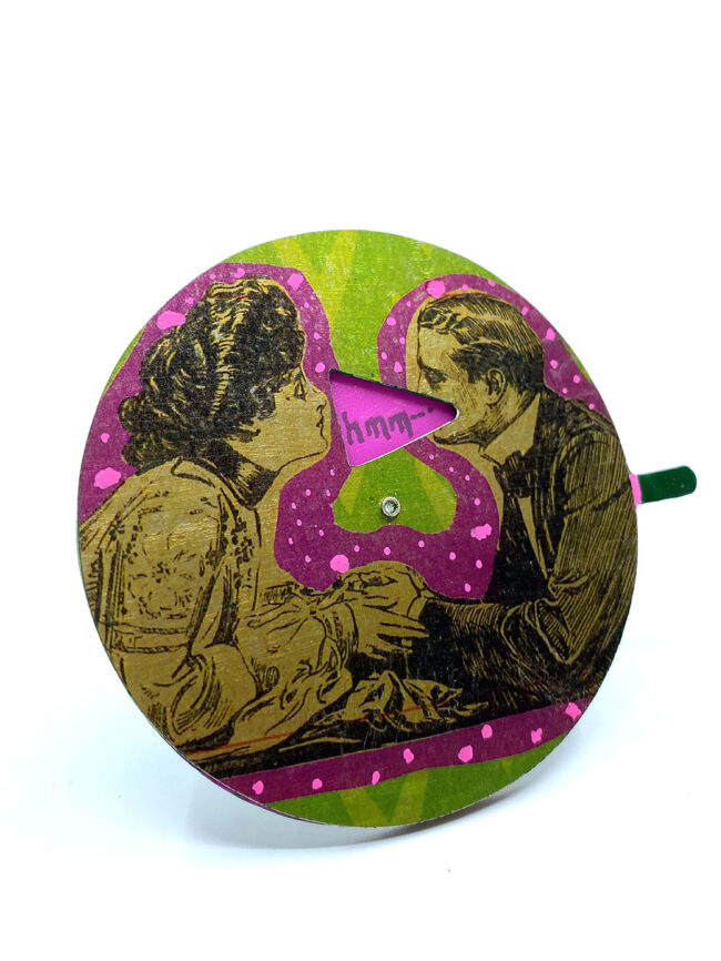 “Bla Bla” zamanla reflekse dönüşmüş reaksiyonların tahmin edilebilir döngüsünü hem kavramsal hem de fiziksel olarak ele alır. Döngünün doğasına uygun şekilde yalnızca dairesel harekete izin veren bu iş temelde bizi döngüleri kırmaya yönelik reaksiyon göstermeye davet eder. Hareketli parça taşıyan için olduğu kadar izleyici için de tetikleyicidir ve yarattığı tutup çevirme isteği ironik bir biçimde refleksleşmiş bir reaksiyondur.